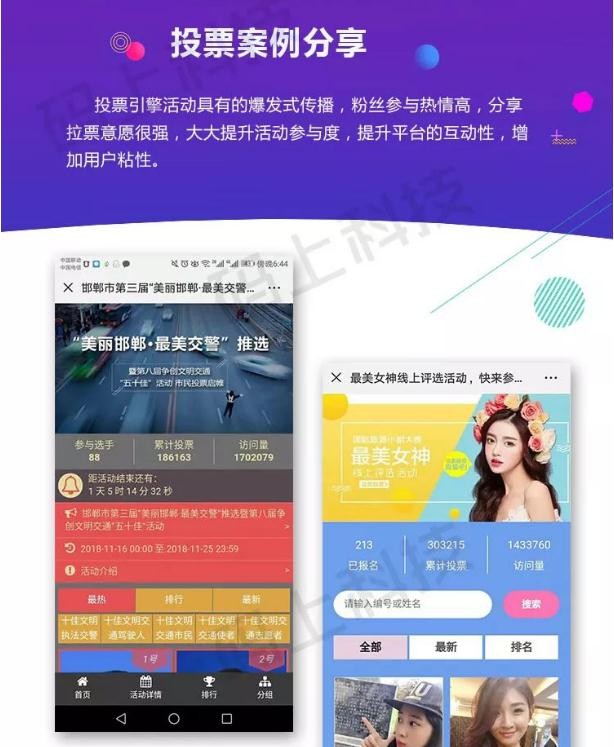 投票活動(dòng)能最大程度地激發(fā)大伙的競(jìng)爭(zhēng)意識(shí),讓參與者通過(guò)微信圈好友轉(zhuǎn)發(fā)讓越來(lái)越多的人參與進(jìn)來(lái)。例如,萌娃,萌寵,攝影,服裝,美食,婚紗,優(yōu)秀員工等各行各業(yè)的投票評(píng)選活動(dòng),是你推廣產(chǎn)品,公眾號(hào)吸粉,營(yíng)銷宣傳的第一選擇。而在幫自家選手拉票的同時(shí),企業(yè)廣告也能通過(guò)社交渠道得到最大程度的曝光。投票活動(dòng)在帶動(dòng)用戶參加的同時(shí),還可以吸引更多的微信粉絲。