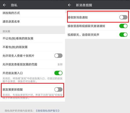 同樣是設置頁面,隱私選項,將【朋友圈更新提醒】關閉,這樣一來,無論什么時候有新朋友圈信息,都不會在“發現”按鈕上出現紅點,吸引你點擊,久而久之,便會大大降低你刷朋友圈的欲望。