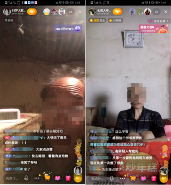 直播時,很多網友評論“如果你被綁架了就眨眨眼”,其實也是在擔心老人深夜直播是否是被人脅迫,而他們的幕后操手無非就是那些追逐金錢與流量的年輕人。