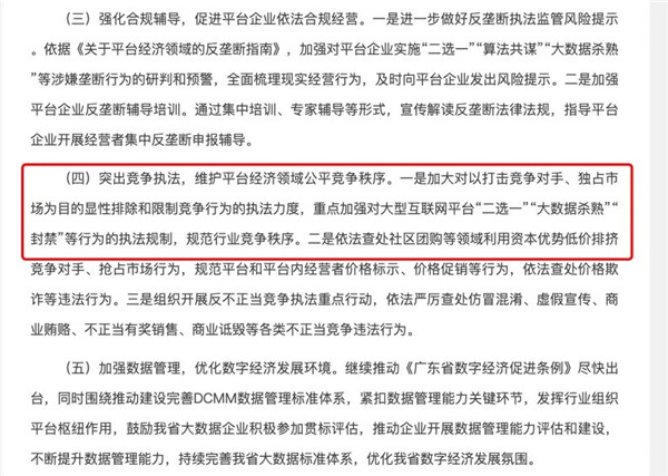 無獨有偶,日前廣東省市場監督管理局在答復廣東省人大代表相關建議時,明確了下一步工作,將加大對以打擊競爭對手、獨占市場為目的顯性排除和限制競爭行為的執法力度,重點加強對大型互聯網平臺“二選一”“大數據殺熟”“封禁”等行為的執法規制,規范行業競爭秩序。