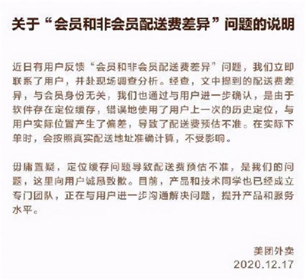 比如,針對網友“漂移神夫”的說法,美團給出的回應是,預估配送費差異與會員身份無關,是定位緩存偏差導致。用戶實際下單的配送費,會按照真實配送地址準確計算,不受影響。