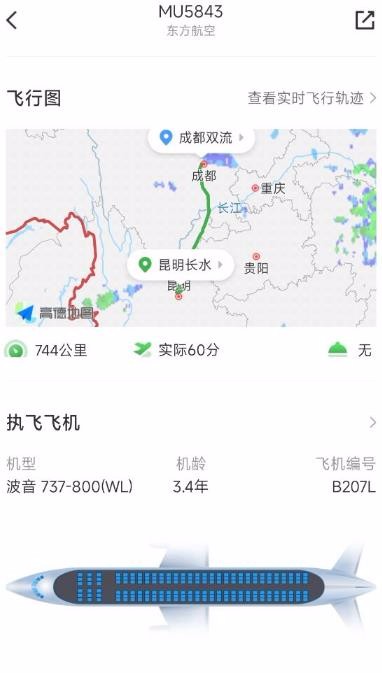 航旅縱橫 App 顯示,MU5843 次航班于 4 月 17 日 10:02 從昆明長水機場起飛,11:02 到達成都雙流機場。4 月 18 日的 MU5843 次航班也將使用波音 737-800 客機。