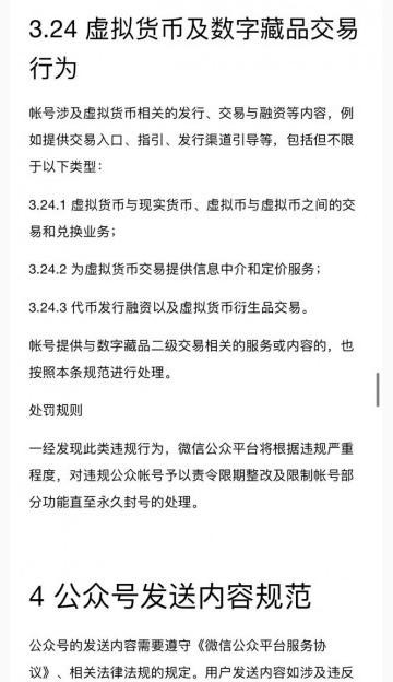 《微信公眾平臺運營規范》新增了“虛擬貨幣及數字藏品交易行為”條目,稱帳號若涉及虛擬貨幣相關的發行、交易與融資等內容,例如提供交易入口、指引、發行渠道引導等,“一經發現此類違規行為,微信公眾平臺將根據違規嚴重程度,對違規公眾帳號予以責令限期整改及限制帳號部分功能直至永久封號的處理。”