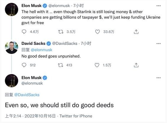 隨后,在馬斯克表示 SpaceX 不能無限期地出資烏克蘭的“星鏈”項目時,有人提及馬斯克此前曾被罵“滾”。就此,馬斯克在評論區回復:我只是按他的建議去做了。