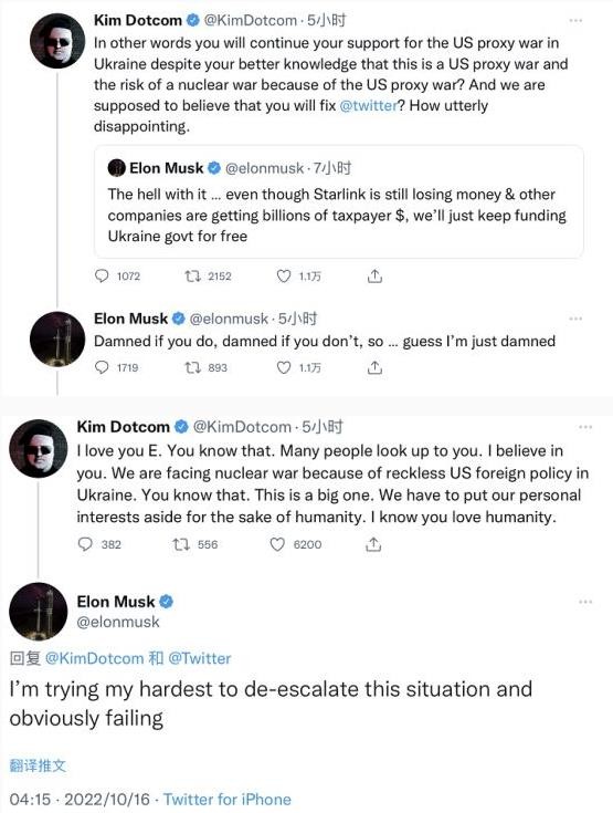 隨后,這名推特用戶接著說:“我喜歡你埃隆,你知道的。很多人都尊敬你。我相信你。由于美國在烏克蘭魯莽的外交政策,我們正面臨核戰爭。你知道的。這是個大問題。為了人類的利益,我們必須把個人利益放在一旁。我知道你熱愛人類。”就此,馬斯克回答說:“我嘗試盡最大的努力以緩解這種情況,但顯然我失敗了。”