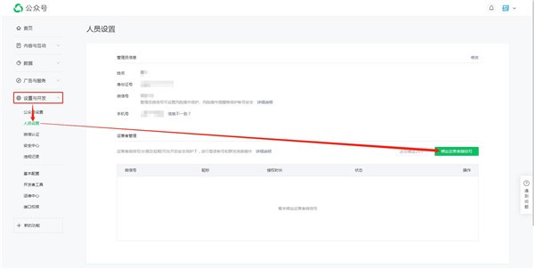 2.在左側菜單最下面找到設置與開發里的人員設置,這樣我們就能看到右側的綁定運營者微信號了。