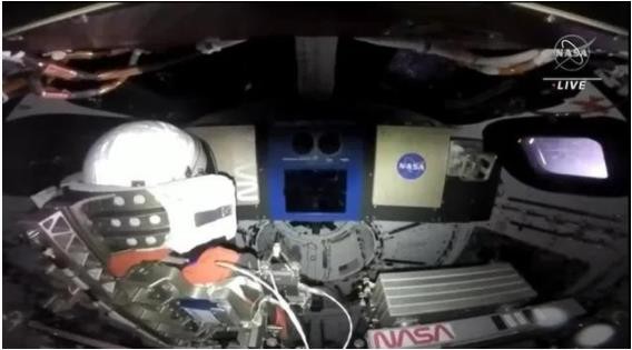 獵戶座在升空約 2 小時后脫離火箭,宇宙飛船內(nèi)外配備 16 個鏡頭,以便從不同的角度拍攝繞月飛行任務(wù)。圖片顯示,升空 9 小時后鏡頭拍到獵戶座一角及部分地球圖像,并有假人指令長坎波斯(Moonikin Campos)坐在艙內(nèi)的照片。假人以 NASA 已故工程師坎波斯命名,他是當(dāng)年把“阿波羅 13 號”宇航員安全送返地球的功臣之一。