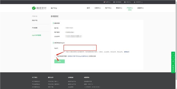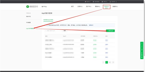 2.進(jìn)入到支付平臺(tái)之后點(diǎn)擊橫向標(biāo)簽的產(chǎn)品中心,然后再點(diǎn)左側(cè)標(biāo)簽的APPID賬號(hào)管理,就會(huì)看到添加關(guān)聯(lián)公眾號(hào)或小程序的AppID按鈕了。