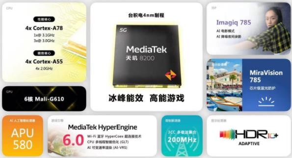 聯發科發布天璣 8200 5G 移動芯片,新品采用 4nm 制程,八核 CPU 架構包含 4 個 Cortex-A78 大核以及 4 個 Cortex-A55 小核,最高主頻最高達 3.1GHz,搭載 Mali-G610 六核 GPU。