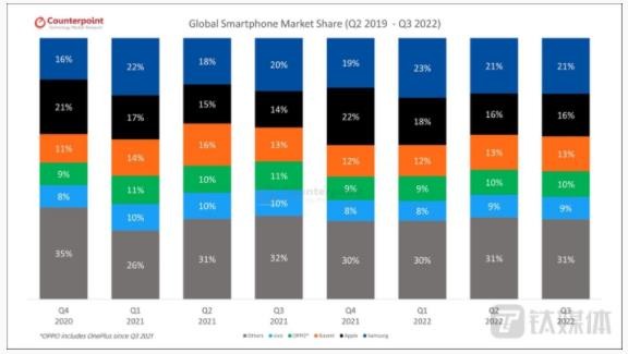 近日,數據調研機構 Counterpoint 發布了 2022 年第三季度全球智能手機銷量統計數據。其中 2022 年全球智能手機市場出貨量為 3.01 億臺,同比下降了 12%,考慮到新品發售季和傳統促銷季疊加的效應,環比提升2% 顯然無法達到外接預期。