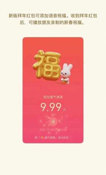 拜年紅包會隨機(jī)選擇一些吉利數(shù)字。比如:1.66、2.88、6.66、8.88、9.99 等。每個(gè)數(shù)字配套帶有不同的祝福語和不同的動(dòng)態(tài)效果。