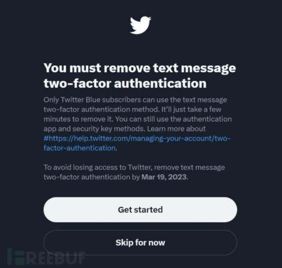 3 月 20 日開(kāi)始,不再支持普通用戶(hù)基于短信的雙因素身份驗(yàn)證(2FA)方式,只有購(gòu)買(mǎi) Twitter Blue 服務(wù)的訂閱用戶(hù)才能繼續(xù)使用。