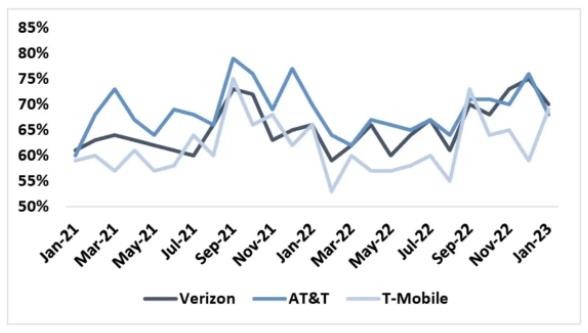 摩根大通在報告中指出:“iPhone 今年 1 月在美國三大運營商(Verizon、AT&T 和 T-Mobile)中的銷售份額為 69%,去年 12 月為 70%。但表現比前代更優秀,iPhone 13 周期中的占比為 67%;而 iPhone 12 周期中的占比為 60%”。
