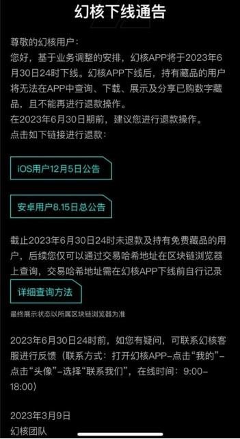 幻核 APP 下線后,持有餐品的用戶將無法在 APP 中查詢、下載、展示及分享已購數(shù)字藏品,且不能再進行退款操作。