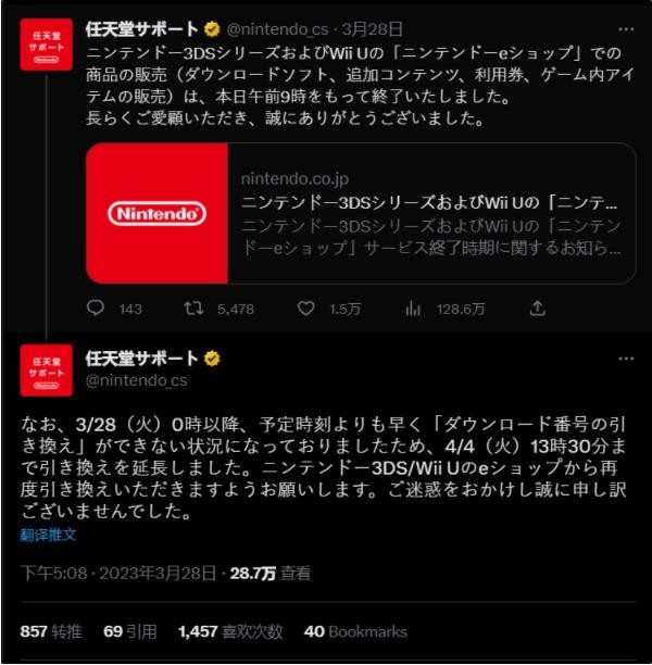任天堂于 3 月 28 日正式關閉了 3DS 和 Wii U 游戲機的線上商店,玩家將無法再購買游戲、新增內容和內購內容。