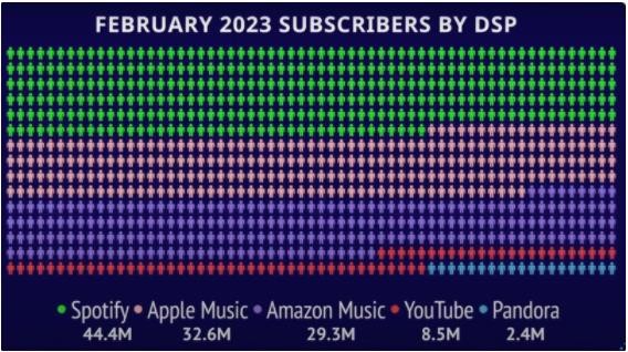 除了蘋果音樂和 Spotify 之外,美國音樂流媒體服務(wù)的前五名還包括亞馬遜音樂、YouTube 音樂和 Pandora。亞馬遜音樂有 2930 萬訂閱用戶,排名第三;YouTube 音樂有 850 萬訂閱用戶,排名第四;Pandora 有 240 萬訂閱用戶,排名第五。IT之家注意到,前三名之間的差距較小,而后兩名之間的差距較大。