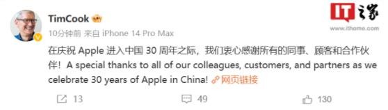 蘋果公司 CEO 蒂姆?庫克今日早間發文,慶祝蘋果進入中國 30 周年,并表示“衷心感謝所有的同事、顧客和合作伙伴”。