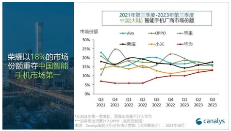 而市場數據也佐證這一判斷,IDC、Canalys和Counterpoint三大機構近日先后發布的統計報告都顯示,榮耀位列2023年三季度中國智能手機市場第一。