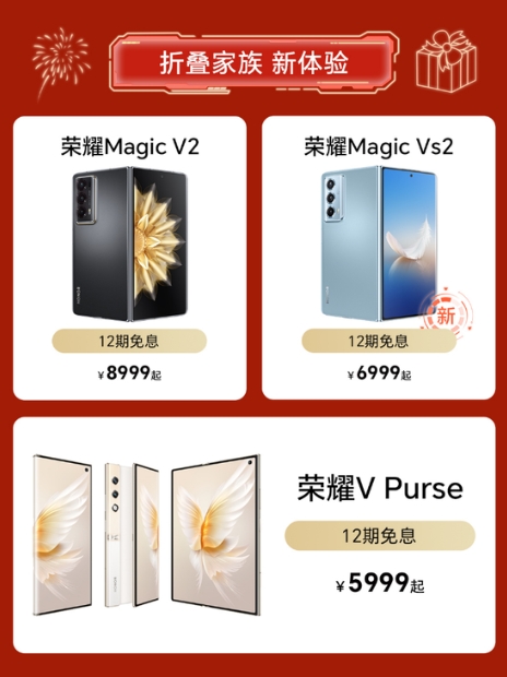 榮耀V Purse首次將橫向折疊屏手機的價格下探至5999元,以科技與時尚的完美融合,滿足追求潮流個性消費者的需求,在榮耀雙十一開門紅中戰績非凡。本次雙十一開門紅奪冠的另一款折疊屏榮耀Magic Vs2,起售價僅為6999元,全面均衡的表現,適合作為主力機使用。這兩款機型均已進入傳統直板機高端旗艦款價格區間,進一步推動橫向折疊屏手機價格上的親民化,減少直板屏手機用戶使用折疊屏手機的經濟遷移成本,進而帶動折疊屏手機市場的發展。雙十一期間,榮耀折疊屏全系列還推出了12期免息活動,進一步降低消費者入手折疊屏手機的門檻。