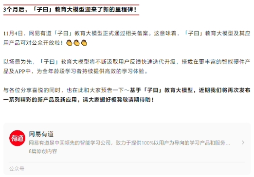 據網易有道官方公眾號,網易有道“子曰”教育大模型今日通過相關備案,該大模型及其應用產品將對公眾開放。