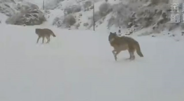 據(jù)這位游客描述,當(dāng)天賽里木湖被雪覆蓋,一片銀裝素裹。他駕車在湖邊的小路上行駛,突然發(fā)現(xiàn)前方有一群動物迎面朝他的車奔來。