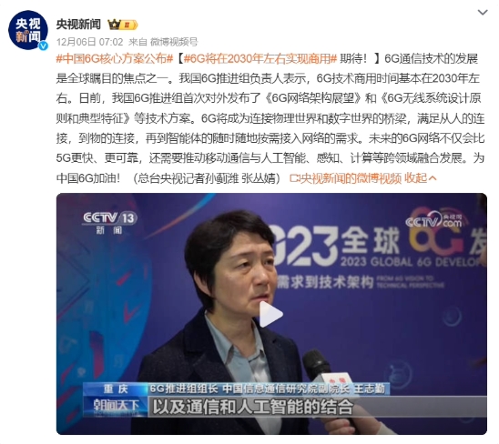 可以看到,本次會議再次提到加快 6G 技術研發。據央視新聞此前報道,我國 6G 推進組組長、中國信息通信研究院副院長王志勤透露,6G 技術的商用時間基本上是在 2030 年左右,它的標準化制定時間會在 2025 年。