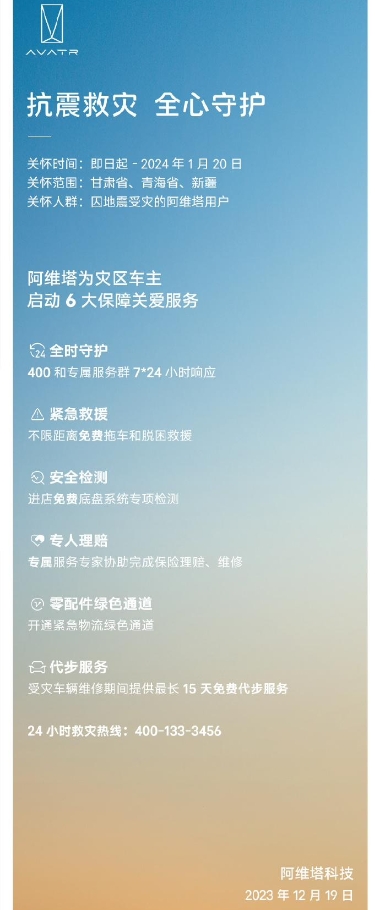 阿維塔今日宣布為甘肅、青海、新疆地震災區車主啟動 6 大保障關愛服務,并開通 24 小時救災熱線。