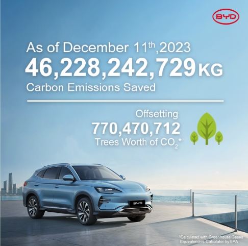 而最新數(shù)據顯示,截止2023年12月11日,比亞迪減少碳排放超過462萬噸,相當于種植超7.7億棵樹。