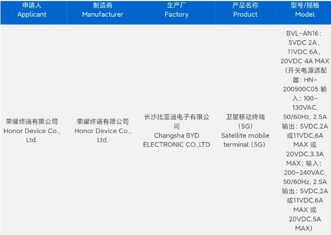 值得一提的是,此前有一款型號為 BVL-AN16 的新機通過中國質量認證中心 3C 認證,支持 100W 快充,產品名稱為“衛星移動終端”,預計為榮耀 Magic 6 Pro 手機。