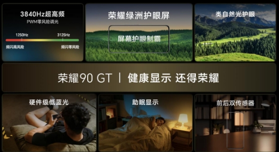 為確保用戶用眼健康,榮耀90 GT配備行業(yè)唯一的零風(fēng)險調(diào)光護眼屏——榮耀綠洲護眼屏,具有3840Hz超高頻PWM調(diào)光、類自然光護眼技術(shù)、助眠顯示功能、360°自適應(yīng)調(diào)光與暗光舒適性調(diào)節(jié)等領(lǐng)先技術(shù),有效緩解長時間游戲?qū)е碌难鄄科冢瑸橥婕規(guī)砣轿唤】当U稀?/p>