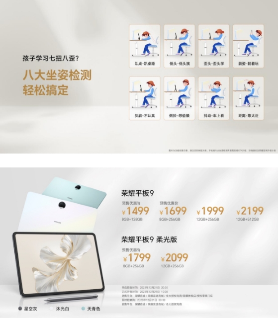 榮耀平板9共推出8GB+128GB、8GB+256GB、12GB+256GB、12GB+512GB四個版本,預(yù)售優(yōu)惠價1499元起。榮耀平板9柔光版推出8GB+256GB、12GB+256GB兩個版本,預(yù)售優(yōu)惠價1799元起。2023年12月21日20 : 30開啟預(yù)售,2023年12月29日10 : 08正式開售。用戶屆時可前往榮耀商城/榮耀親選商城/各大授權(quán)電商/榮耀體驗店/授權(quán)零售門店進行選購。