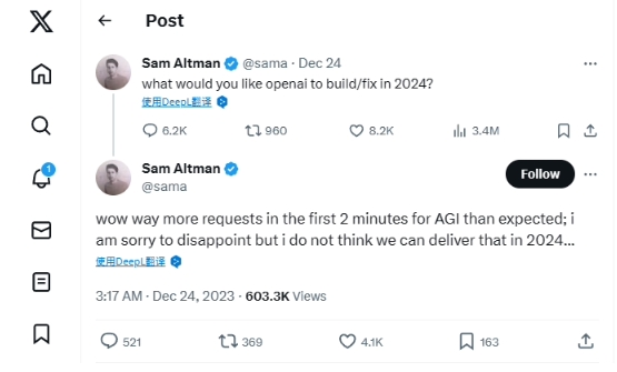 這條帖子是 12 月 24 日凌晨 3:15 分發出的,結果兩分鐘之后,阿爾特曼好像被“嚇到了”,又發了一條推文:“哇,前兩分鐘之內許愿通用人工智能(AGI)的呼聲比我預期的多多了。很抱歉讓大家失望了,我認為我們明年還無法達成這一目標……”