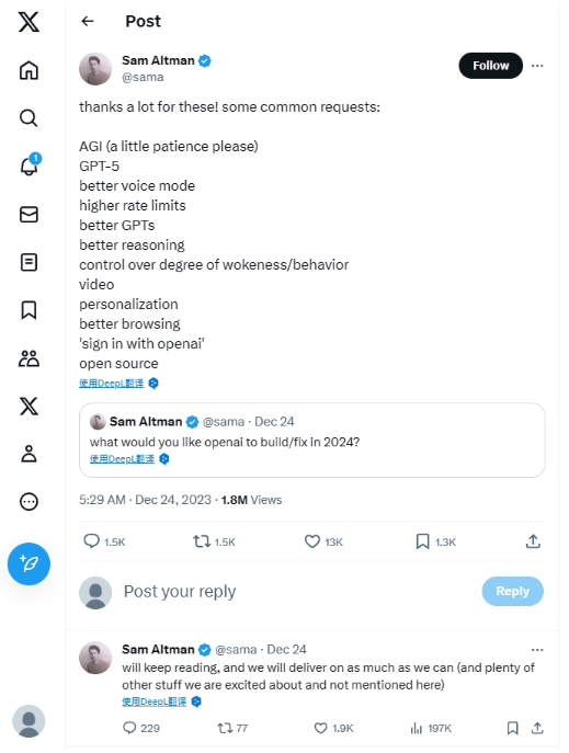 OpenAI 阿爾特曼曬網友新年愿望清單:通用人工智能(AGI)等呼聲最多