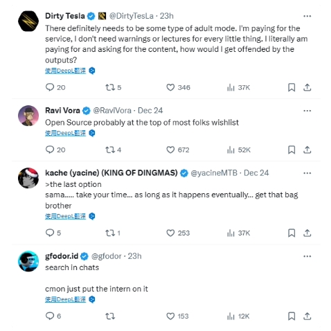 在評論區中,還有多條熱評提出了不同的想法,比如希望能夠新增成人模式、提升開源的優先級、在聊天中加入搜索功能等。