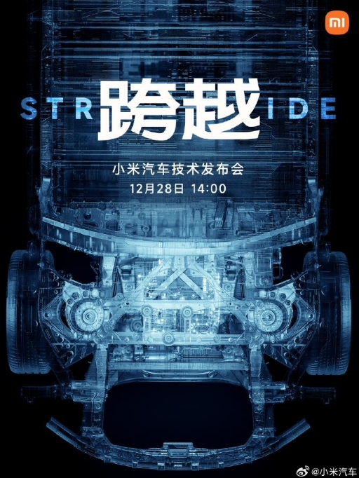 小米汽車技術發布會官宣 12 月 28 日下午 2 點舉行。官方放出了一張汽車底盤的預熱海報,配文“跨越 / STRIDE”。