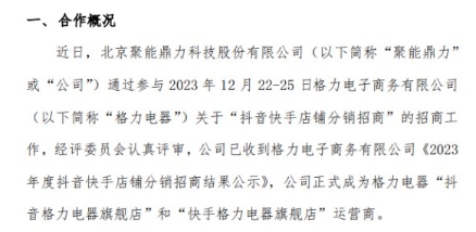 聚能鼎力近日發布公告,北京聚能鼎力科技股份有限公司(以下簡稱“聚能鼎力”或“公司”)通過參與2023年12月22-25日格力電子商務有限公司(以下簡稱“格力電器”)關于“抖音快手店鋪分銷招商”的招商工作,經評委員會認真評審,公司已收到格力電子商務有限公司《2023年度抖音快手店鋪分銷招商結果公示》,公司正式成為格力電器“抖音格力電器旗艦店”和“快手格力電器旗艦店”運營商。