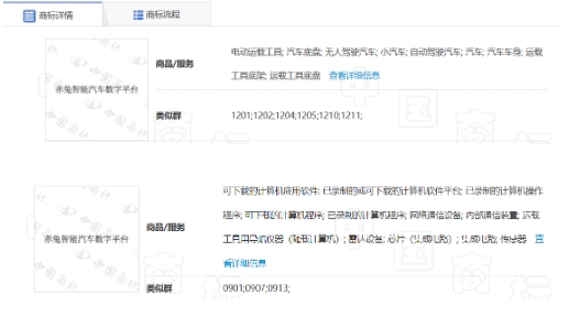 這枚商標分類不僅包含網絡通信設備、 芯片(集成電路)、 集成電路等,還包含電動運載工具、汽車底盤、無人駕駛汽車、小汽車、自動駕駛汽車、汽車車身、運載工具底架、運載工具底盤等商品 / 服務。