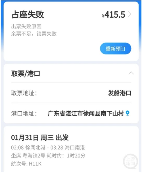 在"粵海鐵票務預訂"平臺,上游新聞記者選擇徐聞北港至??谀细鄣?quot;小車及隨車人員"票,可以預訂的日期,截至2月3日,有多個班次的新能源車型票,但多次嘗試購票,系統均顯示:占座失敗,余票不足。而同一時期班次,燃油車則有余票。