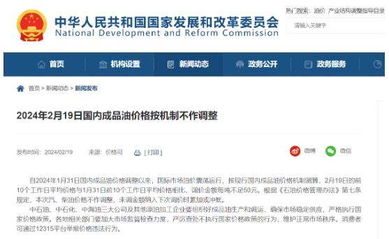 國家發(fā)改委發(fā)布公告,2024 年 2 月 19 日國內(nèi)成品油價格按機(jī)制不作調(diào)整。