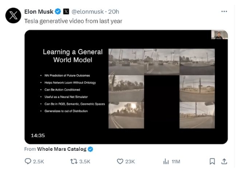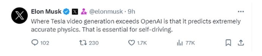 在一條回復用戶的評論中馬斯克指出,“特斯拉視頻生成超越OpenAI的地方在于,它預測了極其精準的物理場景,這對自動駕駛至關重要。”