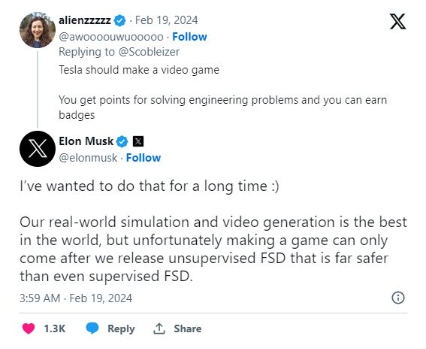 另有一位用戶發帖稱,“特斯拉應該做一款電子游戲”,這位首席執行官回應道,他想做這件事已經很久了,他認為特斯拉的“真實世界模擬和視頻生成是世界上最好的”。