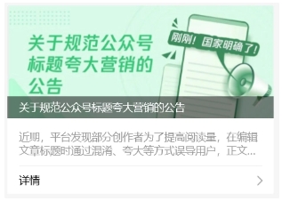 微信官方表示,文章標(biāo)題是用戶識(shí)別文章內(nèi)容的首要依據(jù),選擇恰當(dāng)?shù)臉?biāo)題能給用戶提供良好的閱讀體驗(yàn)。平臺(tái)建議運(yùn)營(yíng)者在創(chuàng)作內(nèi)容時(shí),使用準(zhǔn)確、清晰、能體現(xiàn)文章內(nèi)容主旨的標(biāo)題。對(duì)于利用煽動(dòng)夸大、仿冒官方等方式吸引用戶點(diǎn)擊的文章和賬號(hào),平臺(tái)將根據(jù)違規(guī)程度做出相應(yīng)的處理。