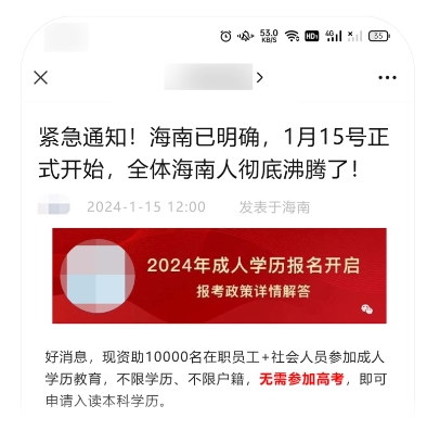 標(biāo)題宣稱緊急通知,明確指向“全體海南人”,誤導(dǎo)該群體用戶以為出臺(tái)與其相關(guān)的政策,而正文實(shí)則是教育課程營(yíng)銷廣告,也并未限制區(qū)域。