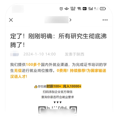 標(biāo)題通過強(qiáng)烈煽動(dòng)性的表述“徹底沸騰了”來夸大事件的影響面,讓人誤以為是出臺(tái)了相關(guān)通知 / 政策,而正文實(shí)則是與標(biāo)題描述不相符的培訓(xùn)課程廣告。