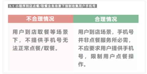 1)小程序到店點(diǎn)餐/取餐業(yè)務(wù)場(chǎng)景下不得強(qiáng)制收集用戶手機(jī)號(hào) 。