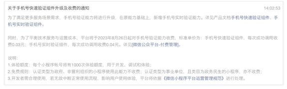 去年8月,還有另一份關(guān)于微信小程序的與手機(jī)號(hào)獲取相關(guān)的公告,也已在當(dāng)下發(fā)生了影響。即小程序手機(jī)號(hào)快速驗(yàn)證能力,面向開(kāi)發(fā)者(即品牌商家)收費(fèi)。