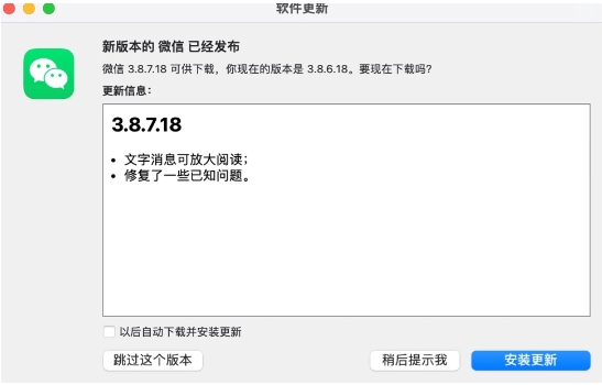 微信 macOS 版 3.8.7.18 更新:文字消息可放大閱讀 09:09:24