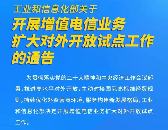 工業和信息化部近日發布通告,部署開展增值電信業務擴大對外開放試點工作。