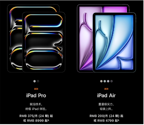 iPad Air則首次推出了11英寸和13英寸兩種尺寸,配備M2芯片以及Liquid視網膜顯示屏。iPad Pro售價為人民幣8999元起,iPad Air售價為人民幣4799元起,將于5月9日上午9時起接受訂購,5月15日起發售。