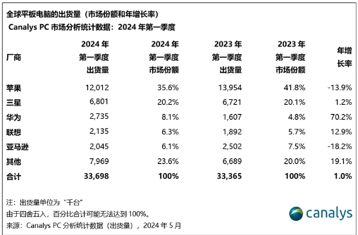 Canalys最新數據顯示,2024年第一季度,全球平板電腦出貨量繼連續四個季度下滑后首次實現小幅增長。蘋果以1200萬臺出貨量,仍占據最高市場份額。但在前四大廠商中,只有蘋果的出貨量同比下滑13.9%,其余廠商均取得增長,且蘋果的市場份額從去年同期的41.8%下滑到35.6%。